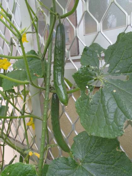 畑では,夏野菜がぐんぐん育っています。今日は,キュウリを5本も収穫することができました。なかなか育たないので,初めは心配していましたが,梅雨の雨で生き返りました!