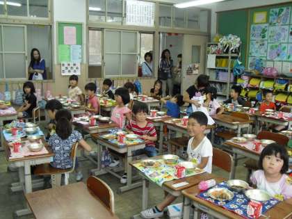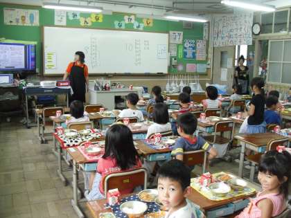 7月7日,太秦小学校の栄養教諭の小林美恵先生をお招きして給食試食会を実施いたしました。給食についてお話を聞いた後,教室での様子を参観し,試食を致しました。