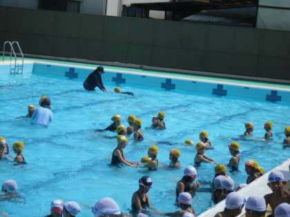 や伏し浮きの練習をし,泳ぐことへつなげてい