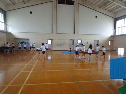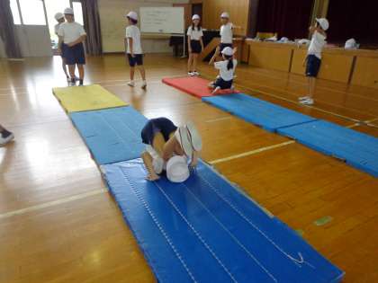 5年生のマット運動では,前転・後転・開脚前転・開脚後転に加え,側方倒立回転・ロンダート・とび前転・前方倒立回転・倒立前転にも挑戦しています。がんばろう!