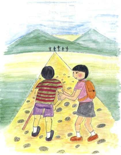 苦手な山登りを友だち同士励まし合って乗り越えるという内容です。互いに信頼し学び合って友情を深め,協力し助け合う心情を育てることをねらいとしています。