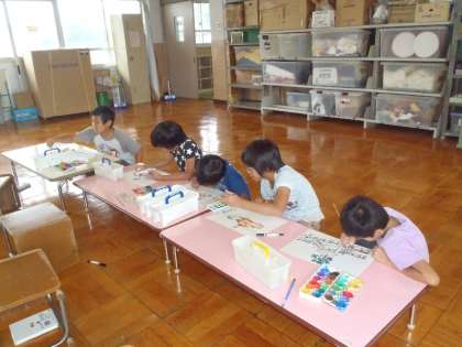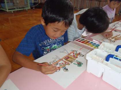 御神輿の絵が描きたい!と意欲満々の子どもたち。さっそく夢中になって描きました。