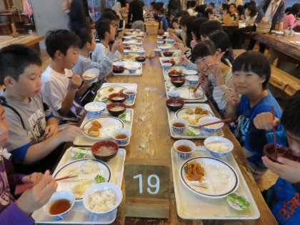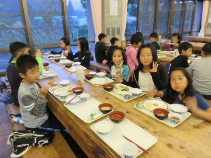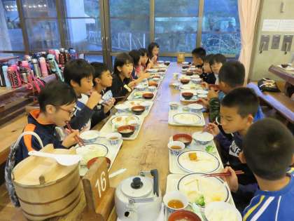 山の家の食堂での初めての食事です。夕食は17:45からのスタートなのでしっかり食べないと夜は腹が空きますので、おかわりする子ども達が多かったです。