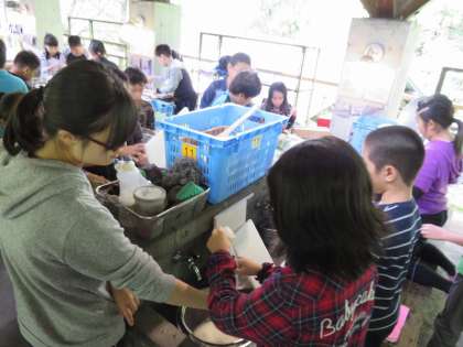 今日のもう1つのメインである野外炊事「豚汁づくり」です。一生懸命、材料を切ったり、かまどに火をつけたりしながら協力し合いました。