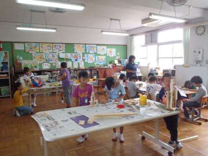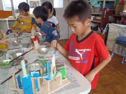 さて,何を作ろうか。ロボット・お家・猫・恐竜・ふね・・・子どもたちはわくわく。作りたいものが決まると,木切れを積んだり,組み合わせたり,好きな形に切ったりして,創作活動に没頭しました。色をつけるのが楽しみです。
