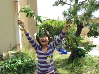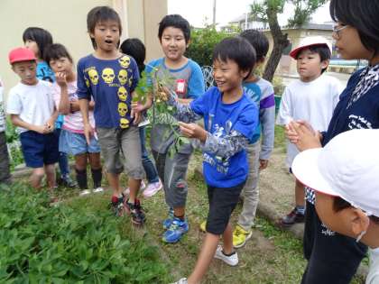 今日は ラッカセイの収穫をしました。虫一つつかない丈夫な葉,鮮やかなオレンジ色のかわいらしい花をつけたむくのき畑のラッカセイ。花が終わってから,収穫の日を待ちました。よいしょとぬいたら,根っこにラッカセイがついていて,みんな大喜び。おいしいことを知っているのか,虫がかじったあともありました。