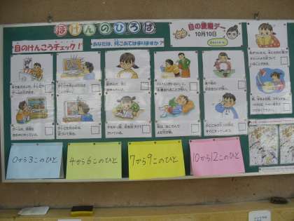 10月1日から各学年ごとに視力検査を行いました。翌日再検査の結果、B(0.9〜0.7)以下のお子さんに「結果のお知らせ」をお渡しました。C(0.6〜0.3)やD(0.2以下)の場合、学習に差し支える場合があります。眼科を受診をおすすめします。学習中の姿勢やテレビ・ゲームの視聴などの毎日の生活習慣が、視力低下の要因になる場合もあります。目にやさしい生活をこころがけましょう。