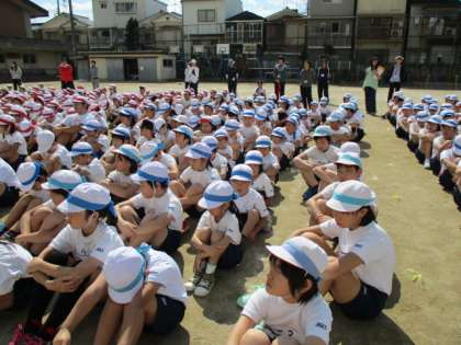 たてわりグループで並び,入場行進をしました。開会式の練習