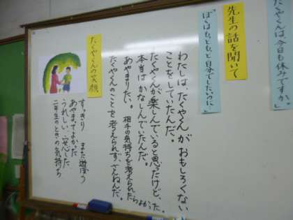 このお話から,たくやくんのことを思ってしていたことが,かえってたくやくんをつらい思いにさせていたこと,相手の気持ちを考えて行動することの大切さに気付くことができました。