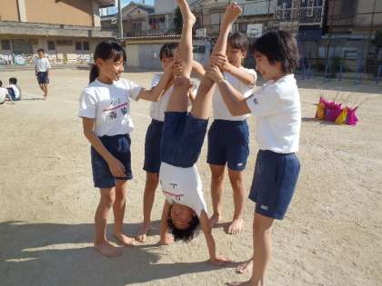 6年生は最後の運動会。砂だらけになって,組体操の練習をがんばりました。練習は大変だったけれど,学年の友だちと心を合わせて練習に励みました。みんなが本番を楽しみにエールを送っています。