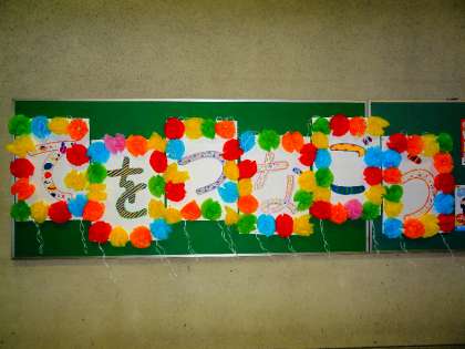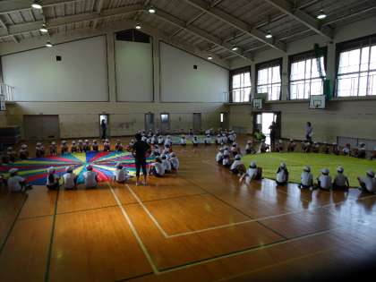 梅津小学校に集合します。みんなで交流し,楽しい運動会にしようと,各学年とむくのき学級で,練習をしています。トップバッターは5年生。体育館でバルーン遊びを楽しみながら練習しました。素敵な「てをつなごう」とテーマの飾りも,5年生の友だちが作ってくれました。