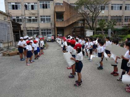 1年生とは50m走と100m走の練習。1年生は,応援団!かわいらしい声援を受けて,みんな頑張って走りました。
