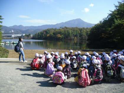 宝ヶ池の木々は,紅葉を始めており,池に映った紅葉と遠くにそびえる比叡山が絵のようにきれいでした。みんなで,しばらくながめてから,どんぐり拾いを始めました。