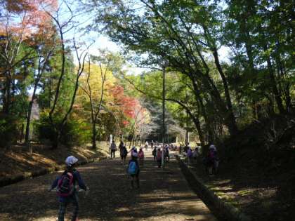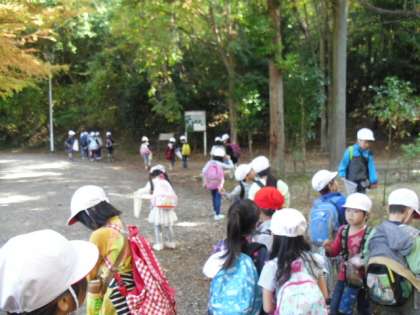 池の周りの散策道を,どんぐりやくぬぎ,色づいた葉を拾いながら,子どもの楽園に向かいました。拾ったどんぐりや葉は,リース作りや作品に使用します。