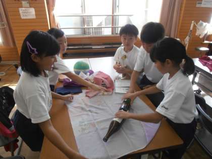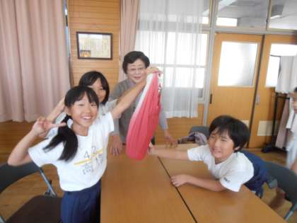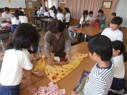 まさに「魔法の布」でした。また,ふろしきで包んだものは,とっても大切な感じがするという感想を述べていました。最後に女性会の方からは,今ではレジ袋や紙袋など,包むものは,ゴミにしてしまうことが多いけど,ふろしきならば何度でも活用できて,環境にもやさしい優れたものであるというお話もうなづいて聞いていました。