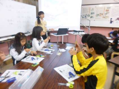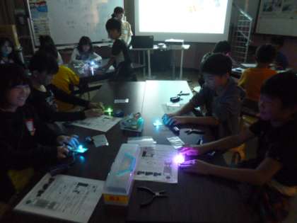 一つのLEDと3つの抵抗器をボール紙に取り付ける作業が難しかったのですが,「モノレンジャー」の方々に助けていただき,みんなステキな作品が仕上がりました。