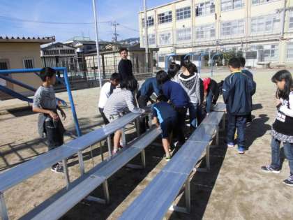 雛壇を組み立て,列になって,はいチーズ。