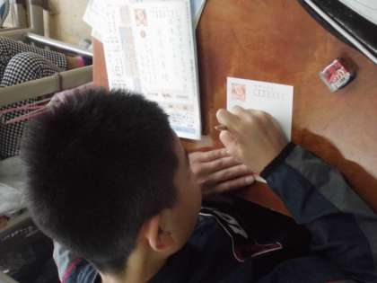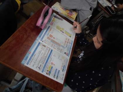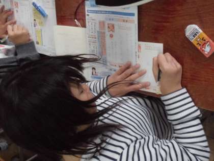 基本的な手紙の形,住所や宛先の書き方などを実際に年賀状を使って書き始めました。