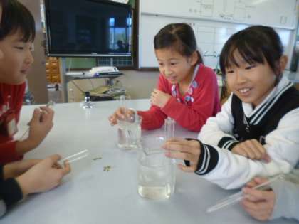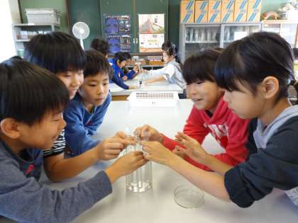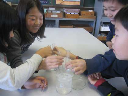 試験管にせっけん水をつけて,お湯であたためるとふくらみ,氷水で冷やすとへこむ様子に大きな反応を示していました。