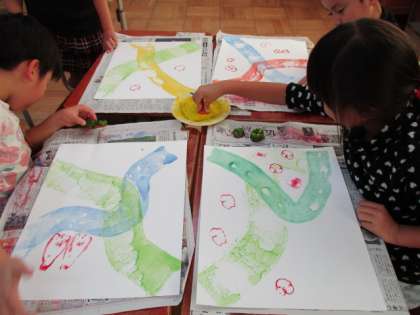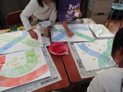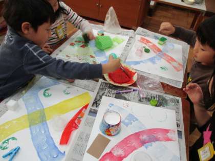 「いろいろ ぺったん」の学習に取り組んでいます。画用紙に,ローラーを使って絵の具の道を作り,その後,型押をしていきます。家から持ってきた,レンコンやピーマンなどのやさいの切り口を型押ししたり,プリンカップや洗濯バサミを型押ししたりして楽しい作品作りをしました。