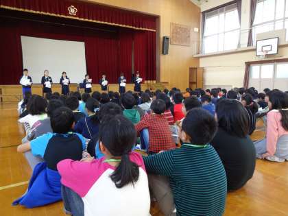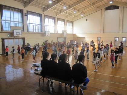 梅津小は,運動会と学習発表会で踊ったエイサーを体育館のフロアいっぱいに広がって行いました。