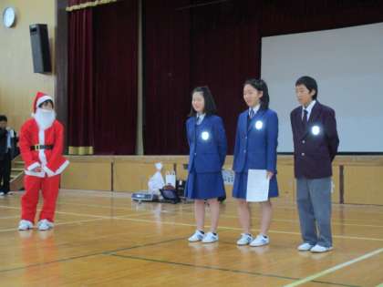 「小中お楽しみ・クリスマス会」と題して,中学生が絵本シアターやレクレーションを行ってくれました。サンタクロースも登場したので,場が盛り上がりました。1年生もお兄さん,お姉さんの司会進行に合わせて行動することができました。