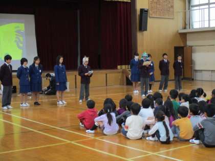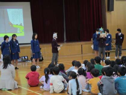 絵本シアターでは,「おまえ,うまそうだな」の絵本を読み聞かせてもらい,1年生は真剣に聞き入っていました。中学生が,かぶり物をして,雰囲気を出す工夫をしてくれたのが,素晴らしかったです。小学校1年生への配慮がうかがえました。