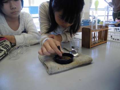 そして,塩酸に鉄が溶けた液を熱すると,何か黄色っぽい粉が出現!