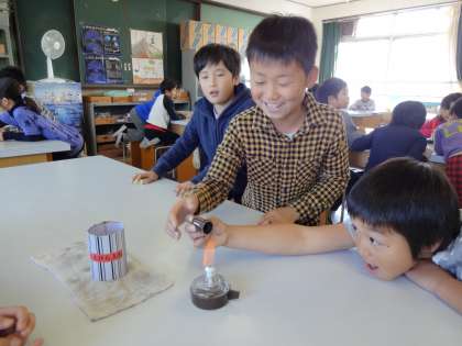 この日は,これからの実験で使うアルコールランプと実験用コンロの使い方を知り,実際に点火してみました。