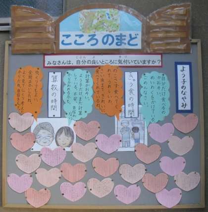 普段の生活ではなかなか自分のよい所に目を向けられない子ども達ですが,友達や家族に言ってもらった言葉から,自分のよい所にたくさん気付くことができたようです。「こころのまど」には,心が温まる言葉で溢れています。