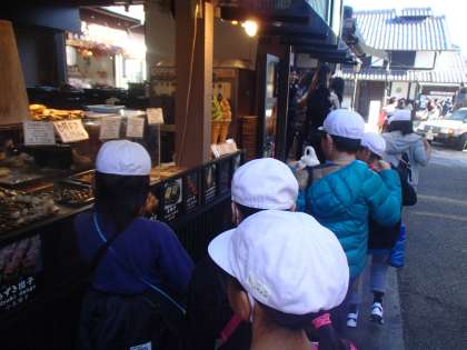 総合の学習では,梅津大好きで学んだことを広げて行こうということで,京都大好きの学習がはじまりました。まずは,京都の魅力を調べるために,嵐山に行ってきました。嵐山に行くと,観光客の多さや外国人の多さに,子どもたちはおどろいていました。また,お寺やホテル,旅館など,文化施設や商業施設がたくさんあることに気づきました。京都の代表的な観光地をまわることで,京都の魅力を探るきっかけになったと思います。