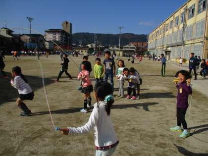中間休みには,大なわとびや短なわとびを持って,みんなで遊んでいます。大なわを回すのも上手になり,「大波,小波」「八の字とび」の練習をしています。