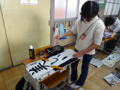 今年初めての書写では,画仙紙を使った書初めに挑戦しました。