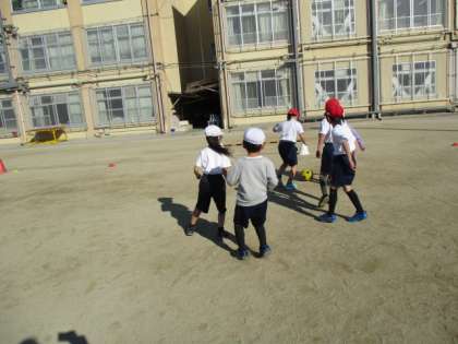 体育科では,「ボールけりゲーム」を行っています。前時にボールを蹴る練習をし,ルールやメンバーを確認しました。