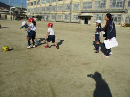 ゲームを始めると,みんな元気よく,ボールに向かっています。うまくパスが通じると得点につながります。蹴りすぎて,ゴールから外れることもあり,悔しがっている姿も見られます。練習を繰り返すうちに,ボール扱いにも慣れてきます。寒さに負けずに,頑張っていきましょう。