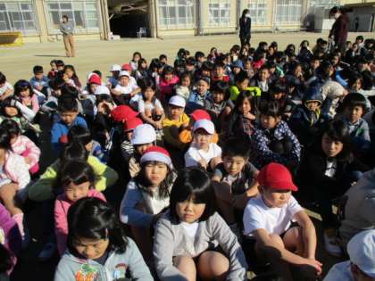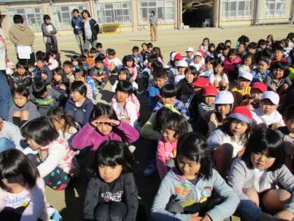 運動場で遊んでいる人は,中央に集まって頭を守る姿勢をすること,教室や廊下などにいる人は,机の下に入り頭を守るなどの体勢で,揺れがおさまるまで待ち,指示を聞くことを練習しました。