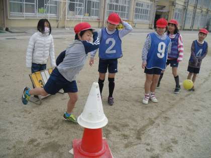 今,体育の学習では,「ハンドベースボール」をおこなっています。4つのチームに分かれて,作戦を立てながら,試合をおこなっています。