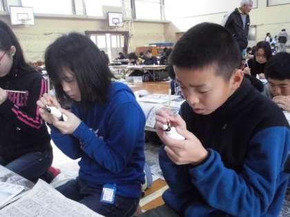 それぞれ自分の作品と向き合いながら,熱心に絵付けを進めます。体育館のしーんとした様子に,すっかり惹きこまれている様子が伺えました。