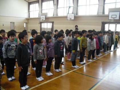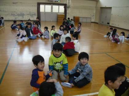「前の人の頭を見て,両手をしっかり伸ばすときれいに並べるよ。」と声をかけると,真剣な表情でがんばる子どもたちでした。
