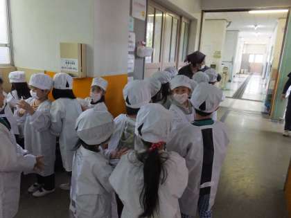 1年生は,エプロン・ぼうし・マスクで身支度し,手洗いの仕方も先生から聞きながら丁寧にできていました。給食当番さんは新しいお仕事を覚えるまで,いろいろな先生が見守ります。