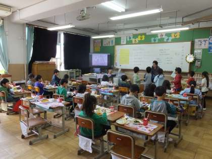1年生をむかえ,一つ学年の上がった給食が始まりました。新しいクラスのお友達と食べる初めての給食。たのしく食べられたでしょうか。