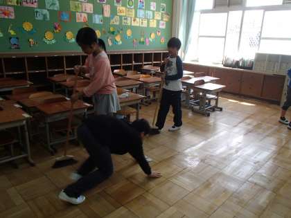 今日から給食も始まり,掃除も始まりました。6年生は1年生の教室の掃除も分担しています。「机もイスも小さいな!」と驚きながらも,黙々と協力して掃除をしていました。