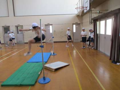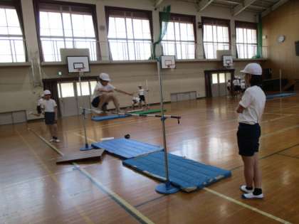 はさみ跳びのような跳び方で,助走・ふみきり・空中動作などを工夫して,自分の記録に挑戦したり,自分にふさわしい相手と競争したりして楽しみます。