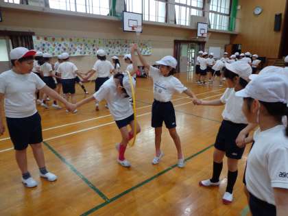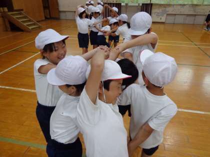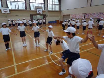 「仲間作り」「人間知恵の輪」「フラフープ送り」をしました。