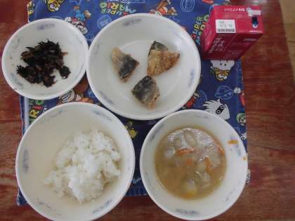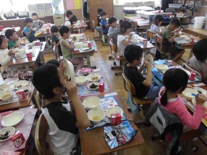 一年生の教室をのぞくと,にぎやかに,そしてきちんとお皿を持って食べていました。