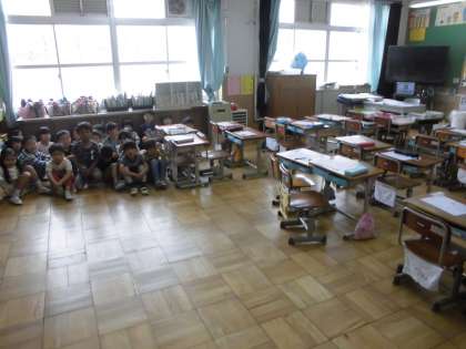 教室では扉を施錠して,廊下側と反対に集合し,非常時に備えました。