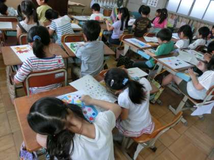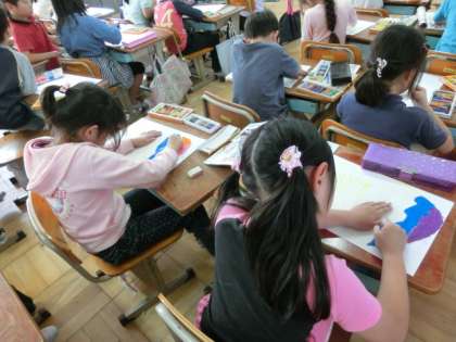 図工の学習で,自分だけの「ひみつのたまご」を描いています。