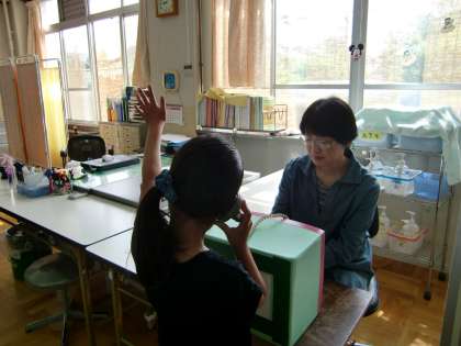 耳に機械を当て,小さな音を聴きます。30人以上保健室に子どもたちがいるのに,とても静かです。お友達が検査をしている時には,音を立てません。素晴らしいです。聴力検査がスムーズに進みました。