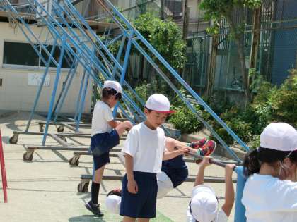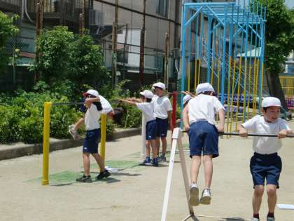暑い中,運動場で鉄棒の学習が始まりました。まずは,体ならしです。2年生の復習です。鉄棒におさるのようにぶら下がったり,こうもりのようにぶら下がったり!2年生の時は,手を離すのが怖かった子も,「3年生になってできるようになった!自分でもびっくり!」と大騒ぎ☆できるようになるっていいものです。みんな,いい顔をしています。
