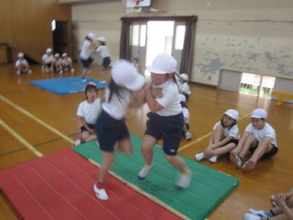 相手に勝つための姿勢や当たり方,かわし方,押し方を工夫して,おしずもうやけんけんずもうをしました。